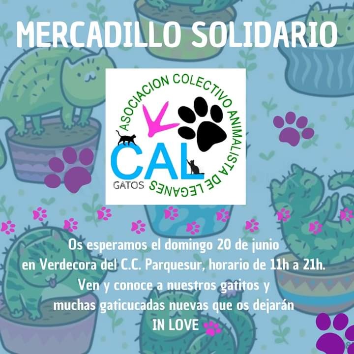 Mercadillo solidario el 20 de junio de 2021 en Verdecora, centro comercial Parquesur, en Leganés, de 11 a 21 horas y asistirán varios de nuestros voluntarios por turnos y algunos de nuestro gatos. Puedes consultar qué gato va en nuestras redes sociales.