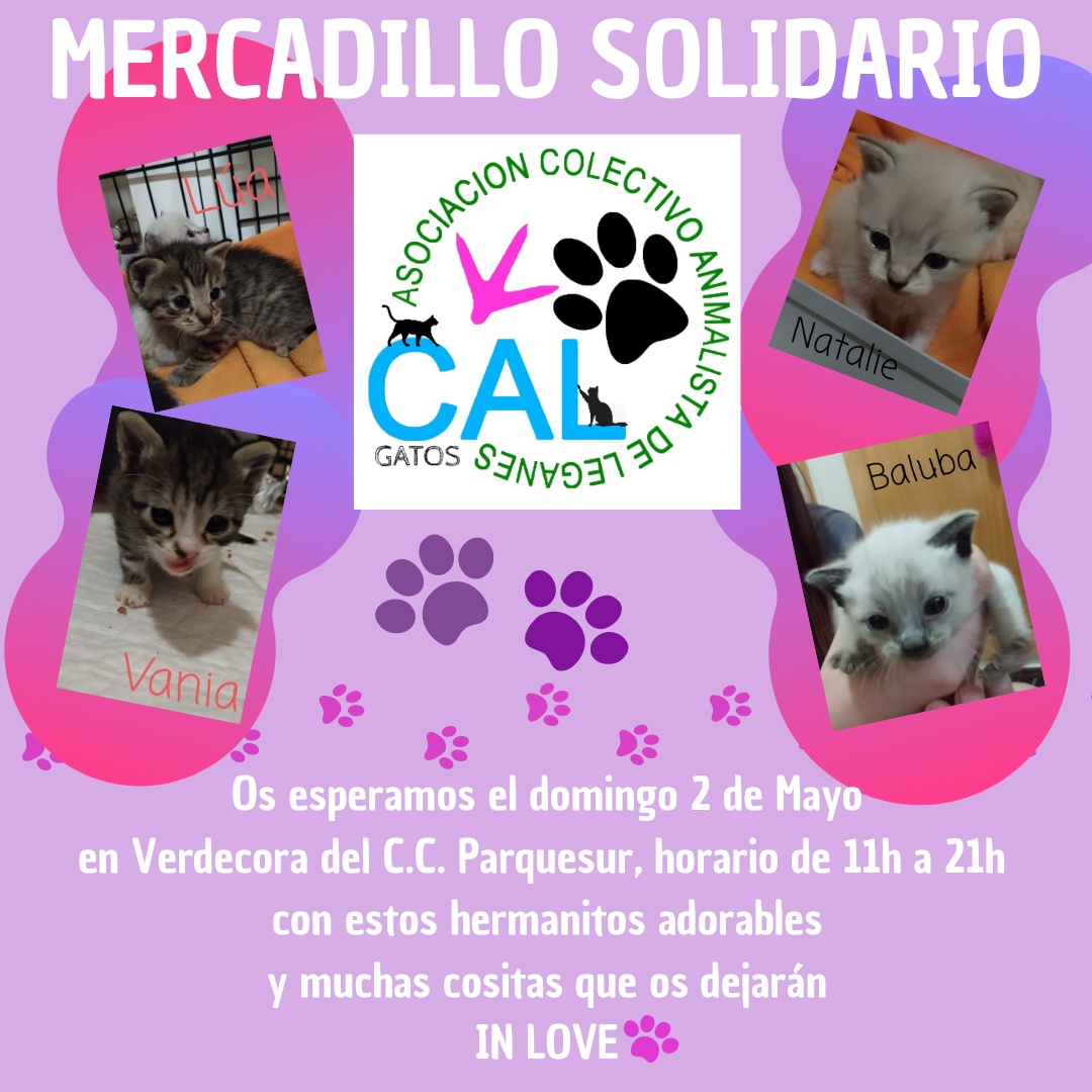 Mercadillo solidario el 2 de mayo de 2021 en Verdecora, centro comercial Parquesur, en Leganés, de 11 a 21 horas y asistirán varios de nuestros voluntarios por turnos y algunos de nuestro gatos. Puedes consultar qué gato va en nuestras redes sociales.